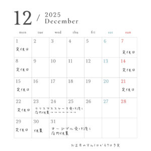 Topics 12月の営業 2025.12.11 Tweet この記事のタイトルとURLをコピーする Tweet Share Hatena Pocket RSS feedly Pin it この記事のタイトルとURLをコピーする 11日、本日臨時休業いただきます 前の記事 12月16日につき 次の記事