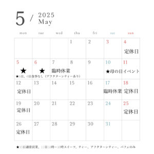 Topics 5月の営業につき 2025.05.07 Tweet この記事のタイトルとURLをコピーする 7日は臨時休業いただきます 母の日イベント開催します🌸 10日(土)おでかけ花市11時ー16時 店内通常営業 11日(日)おでかけ花市13時ー16時 店内12時ー16時(ケーキ、ティー、アフタヌーンティー、パルフェ) 久しぶりの日曜日営業です ぜひこの機会にご来店お待ちしてます Tweet Share Hatena Pocket RSS feedly Pin it この記事のタイトルとURLをコピーする 3月の営業につき 前の記事 6月の営業につき 次の記事