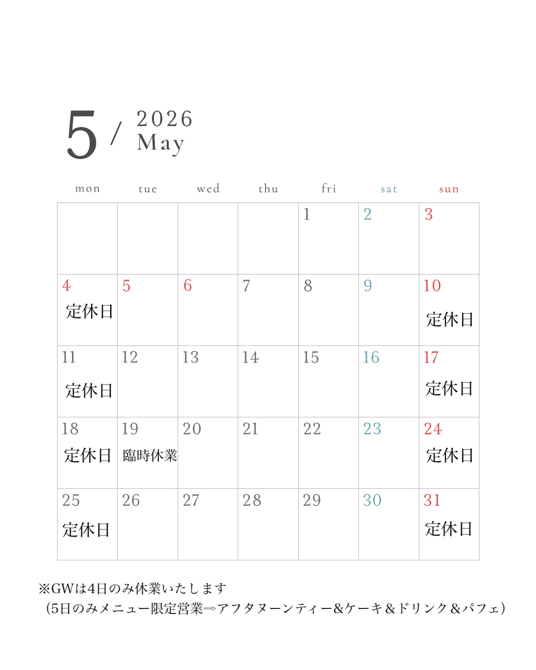 Topics 5月の営業につき 2026.04.28 Tweet この記事のタイトルとURLをコピーする ゴールデンウィークのお席のご予約も 承っております。 よろしくお願いします。 店主 Tweet Share Hatena Pocket RSS feedly Pin it この記事のタイトルとURLをコピーする 4月の営業につき 前の記事